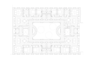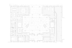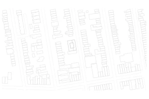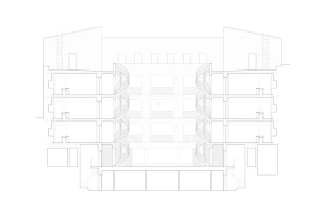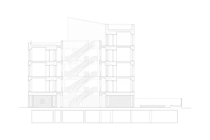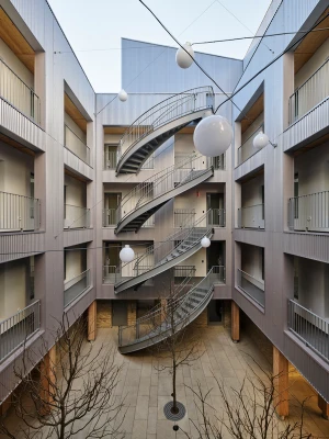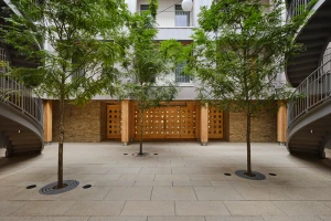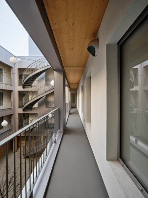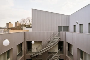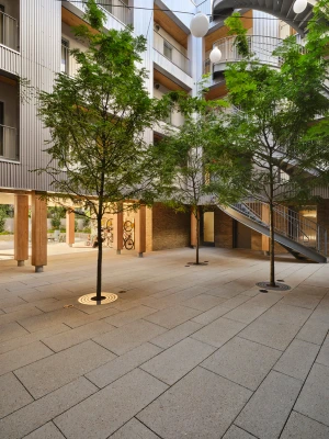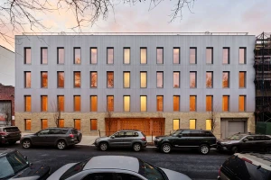 A former parking garage, the site of the latest Frame Home apartment building is located on a tree-lined residential block in Brooklyn, New York. Apartments line the perimeter and bound a central, shared exterior courtyard. At street level, a wood and cast glass block entry screen hints at the building’s wooden structure, and allows glimpses into the courtyard beyond. The courtyard contains dual exterior staircases which lead to open-air walkways and unit entrances. Each unit has three solar exposures to maximize daylight and to engage with the courtyard.