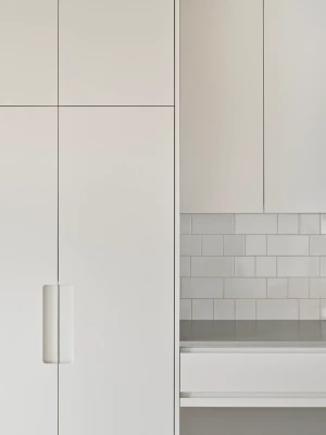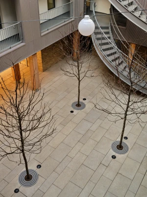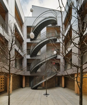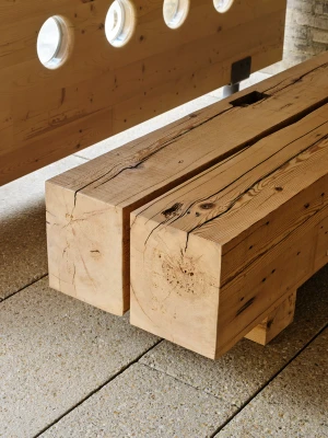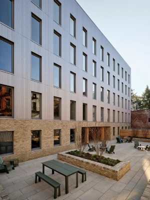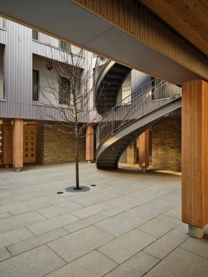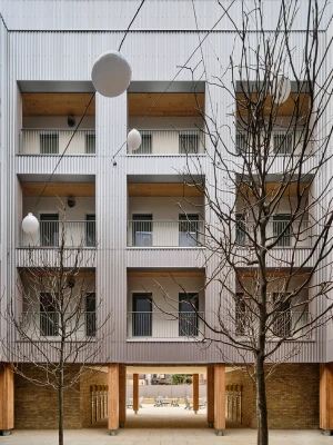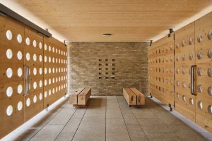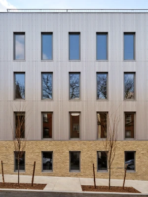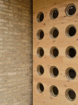 The building entrance features intricately carved Cross Laminated Timber panels, secured with steel clips. Embedded within the wood panels are cast glass blocks, offering both security and soft, diffused light. A reclaimed barn beam has been transformed into a pair of entry benches. Fifteen recessed bricks symbolize the building's apartments.