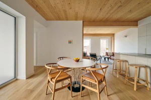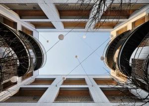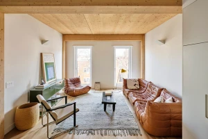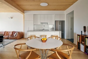 Cross Laminated Timber panels and glulam beams define the interior, infusing each apartment with warmth and a crafted aesthetic. The building’s frame, made from SPF (spruce, pine, and fir), was fabricated in Canada, near the New York State border.
