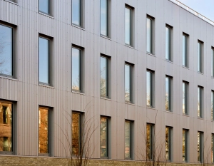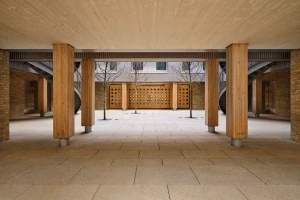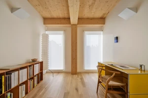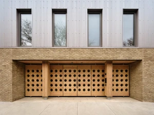 Custom-designed uplights illuminate the Cross Laminated Timber panels, casting a warm glow that accentuates the wood interior and is visible to passing pedestrians. Triple-glazed passive house windows enhance the building’s energy efficiency and provide a quiet, well-insulated envelope.