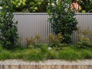 Gardens were installed, and after a season of growth, they began to soften the edges of the planters, casting shade and enclosing the rear yard in calm. Honey locusts, astilbe, autumn fern, and ‘Skinny Gene’ oaks are taking hold, pushing upward to form a layered, tranquil landscape.