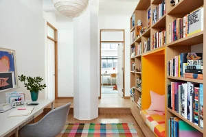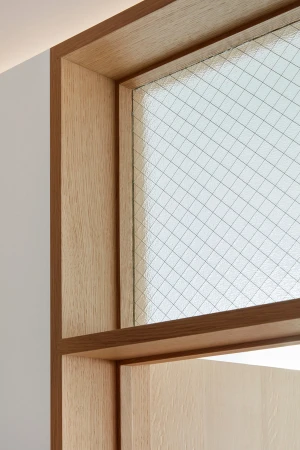 Glass transoms were created to soften the distinction between living and sleeping spaces. Light glows through the glass planes, animated with occupancy. The choice of wired glass was inspired by the building’s original industrial purpose.