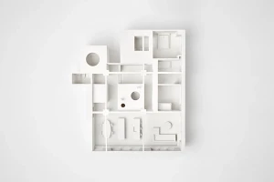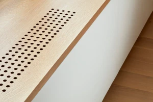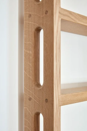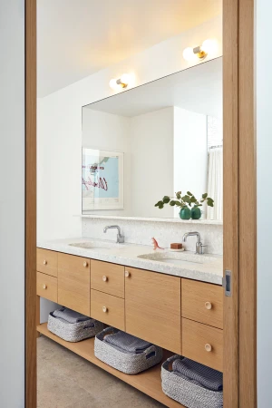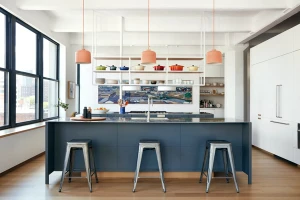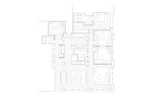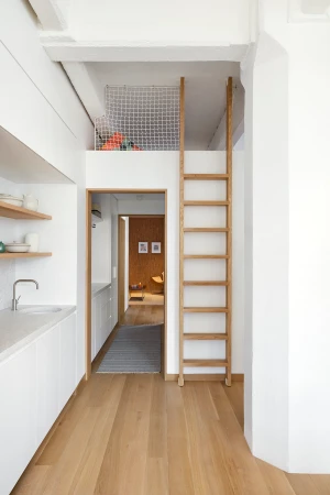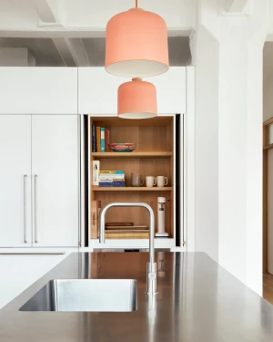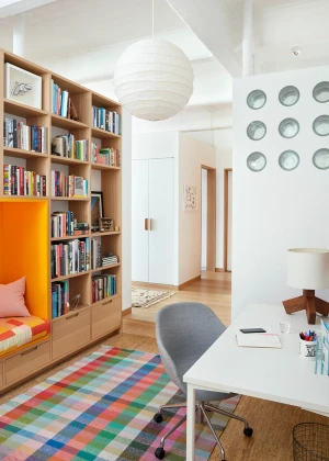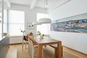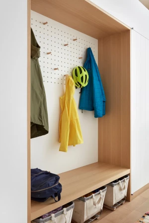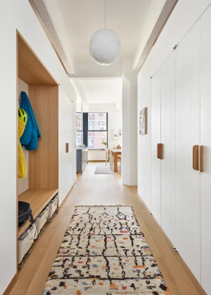 The building is a former cardboard factory recently converted into condominiums. The project centered around combining and reenvisioning two apartments. The existing apartments contained windowless corridors and odd programmatic relationships. Our design work focused on reorganizing the mechanical and sprinkler services. Ducts were relocated under the existing raised floor, allowing soffits to be removed and the concrete ceiling to be exposed. The plan revolves around four newly exposed columns, between which a central volume containing storage and a bathroom were placed. This volume separates the living from the bedroom spaces and is partial height which allows natural light to reach the rear of the loft. At the entry, an oversized peg board allows for the malleability in the placement of wood hooks. A ladder leading to a small loft references one made by the client’s father and allows for access to a small, elevated loft.