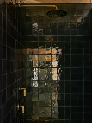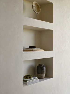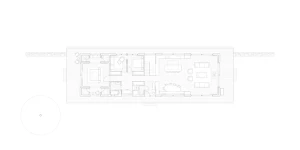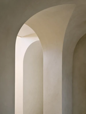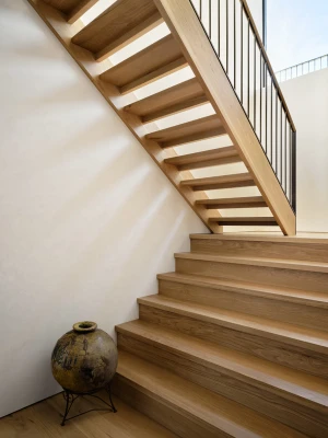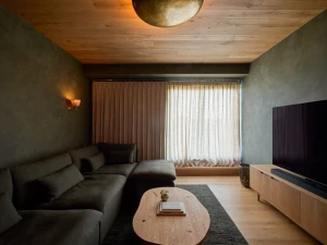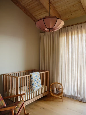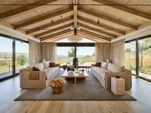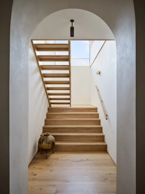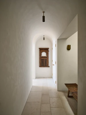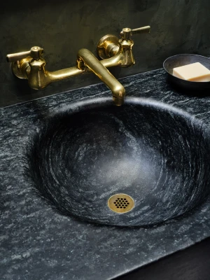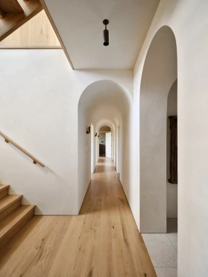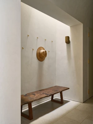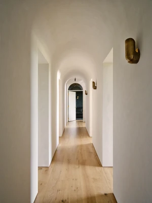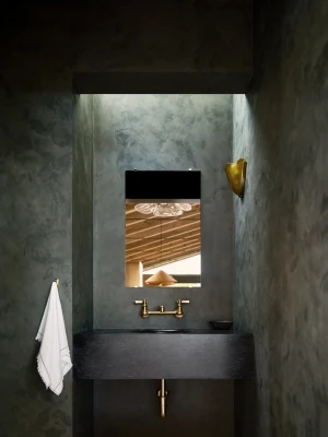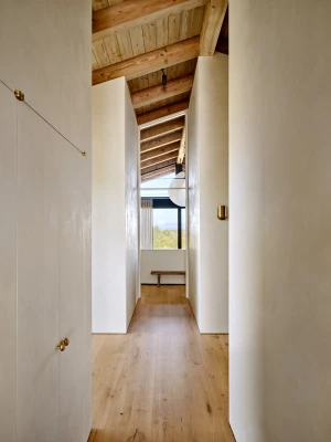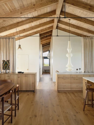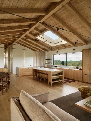 Designed as a retreat for a New York City–based family, the home’s main level is organized around open communal spaces oriented toward the landscape, while private quarters are sequestered at the opposite end. The sunken lower level comprises more introspective rooms: a den, a mudroom, and an office, each modest in scale and contemplative in spirit. Live-sawn oak is paired with rough plaster and warm stone throughout. Unlacquered brass plumbing fixtures and hardware are left to patinate naturally over time, contributing to a material palette defined by a subtle authenticity.
