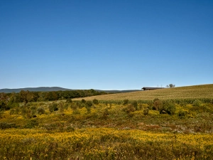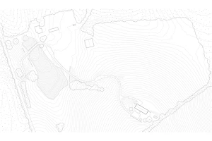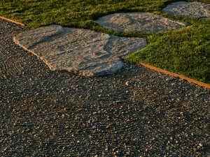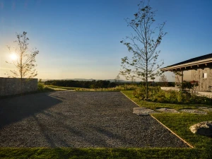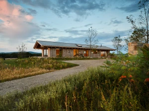 Guests arrive into a gravel courtyard framed by the house, a long stone wall, and a newly planted grove of honey locusts. Meadows gently encircle the property. Large stepping stones draw visitors toward the front door. While defined on three sides, the courtyard opens dramatically to the west, framing a long view of the Catskill Mountains and turning the landscape vista into the courtyard’s fourth façade.