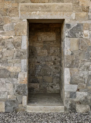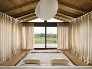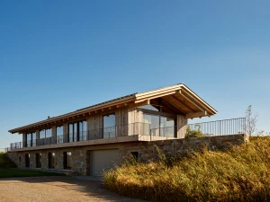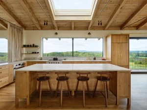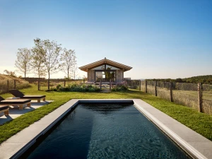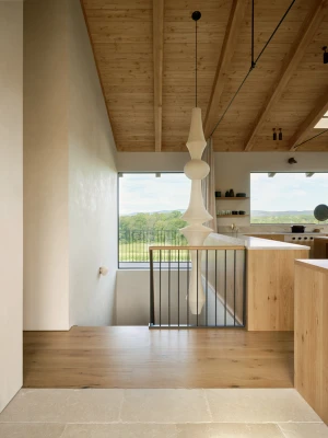 A pool is placed in the landscape past the gable end of the house. A garage entrance is discreetly integrated at the lower level. The base of the home is clad in hand-shaped fieldstone sourced from local farms, a nod to the historic dry-laid walls that define the region. Above, reclaimed barn siding envelops the structure in a well-weathered cladding, offering a new interpretation of the agrarian forms that inspired the project.