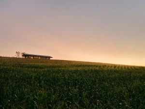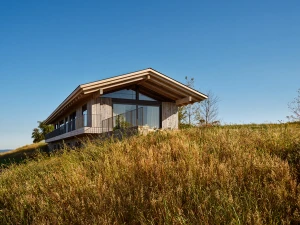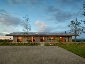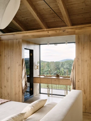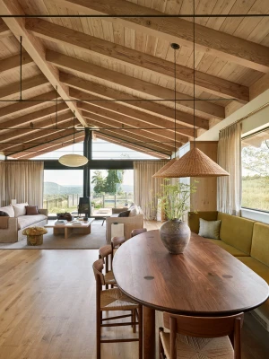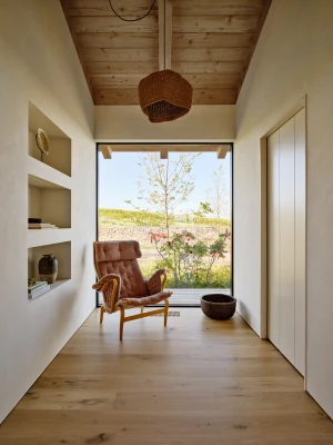 Nestled into the hillside and surrounded by cornfields, the Millerton House surveys sweeping views of the Taconic and Catskill Mountains. Its elongated gable form recalls the language of historic agrarian buildings, while reclaimed silvered barn siding and a hand-laid masonry base root the structure in its landscape. Partially embedded into the earth, the house feels like a discovery. Extended eaves, a wraparound deck, and expansive glazing introduce contemporary moments, softening the threshold between inside and out.