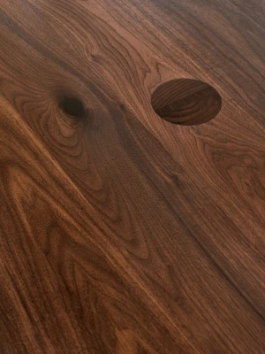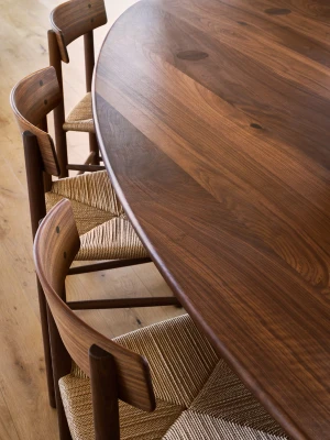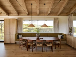 A custom black walnut table, crafted from locally sourced lumber, anchors the dining nook. Its round legs breach the tabletop surface, creating an exposed joint that celebrates the act of making. Positioned along a south-facing window and generous upholstered banquette, the table creates a warm gathering space animated by changing light.