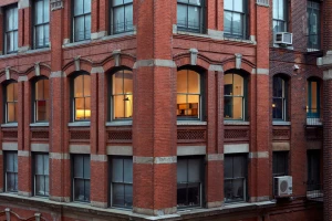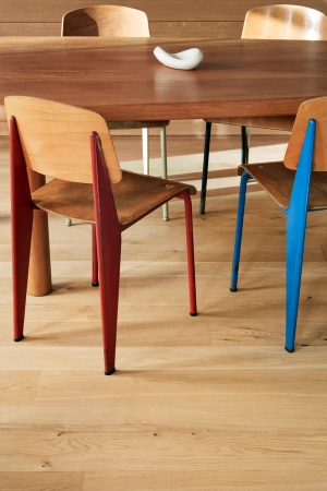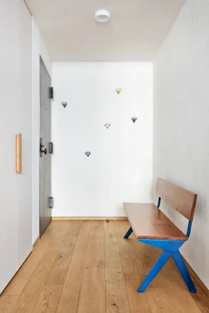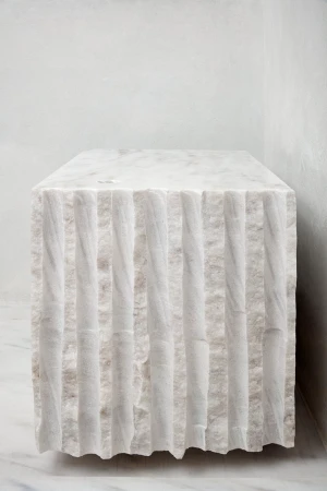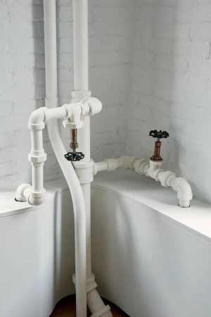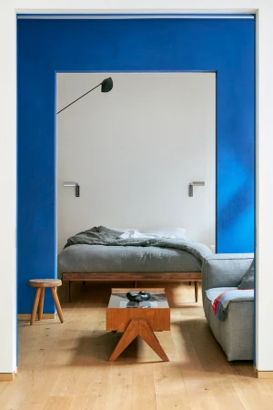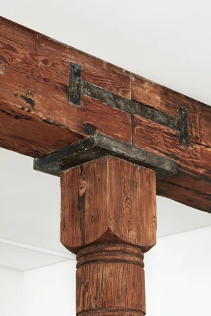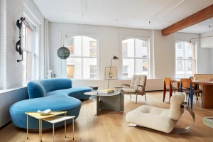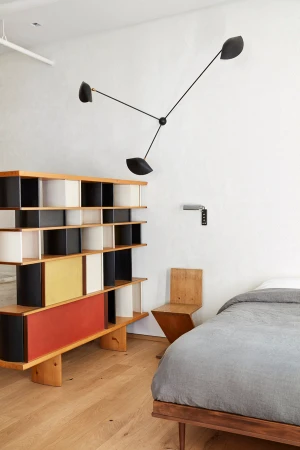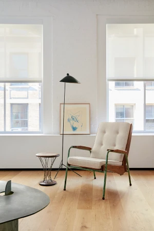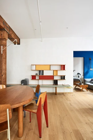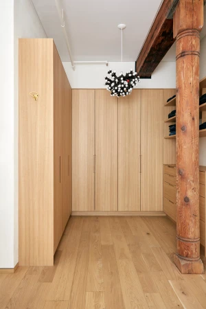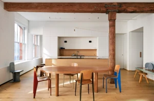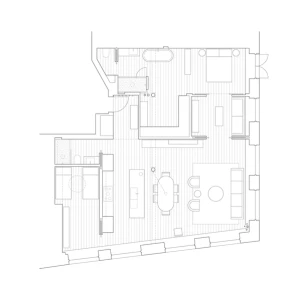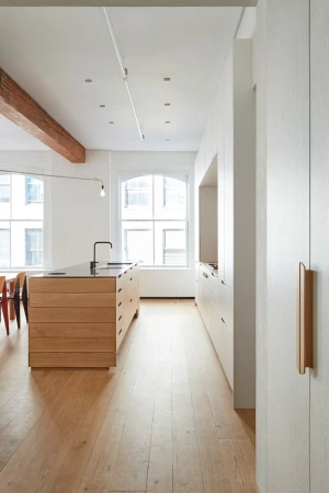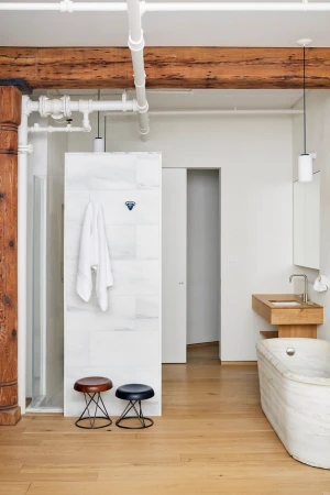 A previous renovation of this SoHo apartment concealed many of the bones of the building, making the space feel spartan and generic. Through the removal of shelving, soffits, and unnecessary additions from renovations past, the loft was stripped back to its original details: wooden beams and columns, brick walls, and exposed sprinkler lines. A bronze countertop with integral sink caps a new millwork island at the center of the open living area. Existing white oak floors were stripped and refinished to their natural color, while walls were treated with a textured plaster to further ground the space and reveal raking light. An ancient Roman marble tub from the previous renovation was reused in the new primary bathroom. The reimagined loft sets a warm, utilitarian stage for the client’s impressive collection of mid-century furniture and design objects.