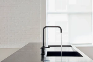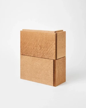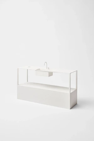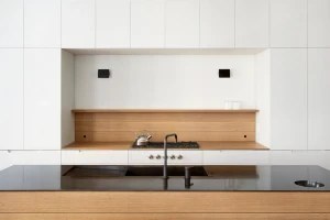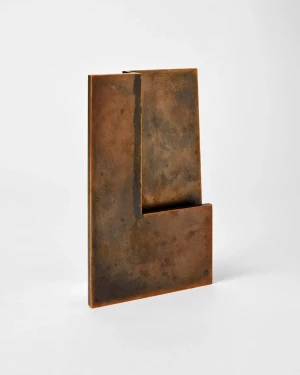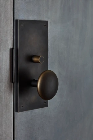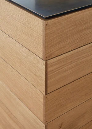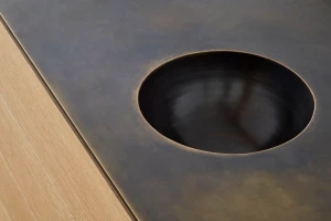The kitchen island is designed as a piece of furniture. A bronze countertop integrates a sink, sponge holder and bowl with a white oak paneled base. Material mockups were commissioned to study expressed joinery corner details and the counter’s patinated finish, unlacquered so as to age with use.